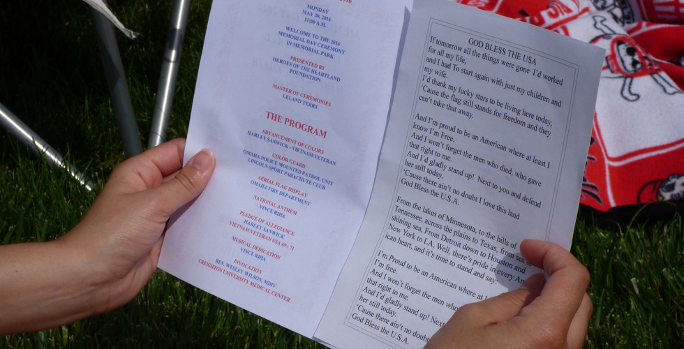 Bien que nous ne soyons pas Américains, nous avons été guidés par notre curiosité et nous nous sommes rendus à la cérémonie d'Omaha. Célébrée non loin de la maison, nous avons assisté à un moment que les Américains adorent. Plus que fiers de leurs forces armées, ils leurs rendent hommage dès qu'ils le peuvent. Le Memorial Day est donc important aux yeux des Américains car ils estiment que c'est grâce à elles si ils sont libres aujourd'hui et si ils se sentent autant en sécurité (on a pas osé leur expliquer que certaines guerres qu'ils ont mené avaient aussi un côté un peu politique et économique, genre le pétrole...).